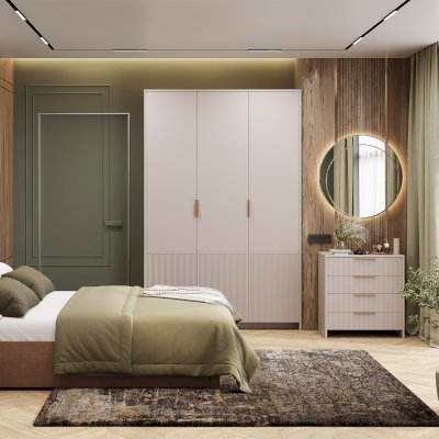- Стильные ручки в цвете «пыльно-матовое золото».